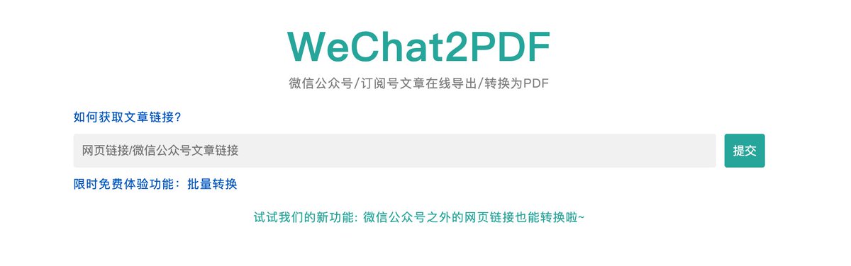 WeChat2PDF 是一个在线工具,用于将微信公众号(订阅号 / 服务号)文章导出并转换为 PDF,便于保存、打印或离线阅读。支持批量链接处理,保留原有排版与图文内容;普通网页链接也可转换为 PDF。 微信公众号(订阅号 / 服务号)文章导出并转换为 PDF https://wechat2pdf.com